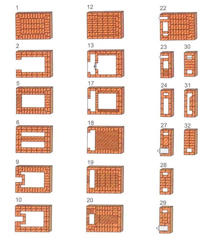A primeira linha inicial é de disposição sólida, para sua construção geralmente é recomendado o uso de argamassa de cimento ou cal. As próximas três fileiras do 2º ao 4º são construídas na forma de um poço, mas com um orifício para o calcanhar, localizado na frente. Em cada linha, o tijolo é colocado com curativo, isto é, com uma série de costuras.