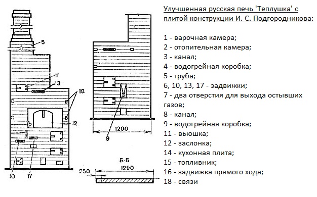 A fim de se livrar da principal desvantagem dos fornos de tijolos - o aquecimento desigual, os projetos padrão estão sendo modernizados. Um exemplo é um fogão chamado “Teplushka”, no qual parte dos gases de combustão da câmara de cozimento é desviada diretamente para a chaminé, e a maior parte corre ao longo dos circuitos de fumaça para gerar calor para as salas.