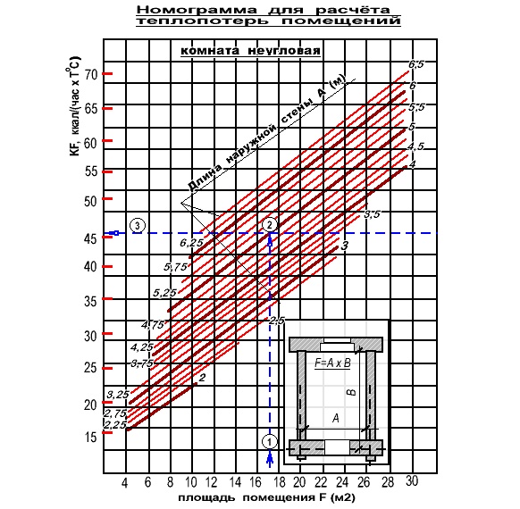 O uso do nomograma apresentado é extremamente simples. No eixo da abcissa deste gráfico, é necessário adiar o ponto 1 - o tamanho da área da sala, que agora estamos lidando com a perda de calor. Ele deve ser puxado até a interseção com a linha inclinada, este é o ponto 2.