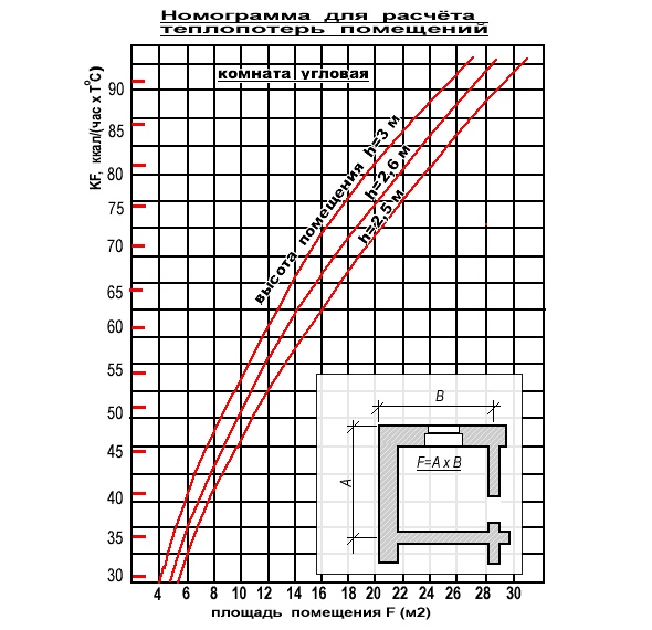Para facilitar o processo de escolha do forno de tijolos mais adequado para alvenaria em um edifício baixo, foram desenvolvidos nomogramas. O gráfico abaixo, que simplifica os cálculos para a seleção de um fogão, foi criado para salas com uma parede externa.