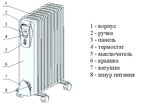 - Elemento de aquecimento. Aquece o óleo, que redistribui o calor para o corpo da unidade e daí para a área circundante.
