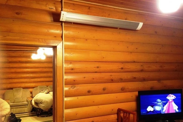 Esse dispositivo é adequado para aquecer casas de uma casa de madeira, pois aquece bem as paredes de madeira e não requer documentação do projeto para instalação. Além disso, a economia de energia é significativa, em comparação com outros aquecedores elétricos - 6-7 vezes.