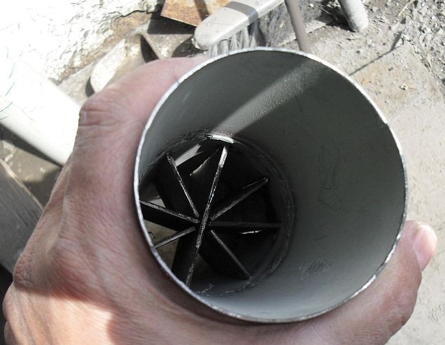 Em seguida, você pode começar a fabricar um trocador de calor. Para fazer isso, você deve usar um tubo de ferro com 8 cm de diâmetro, que não possui paredes muito grossas. Soldamos o bumbum na parede, onde você também precisa fazer um furo.