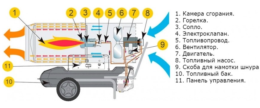Nesses dispositivos, um ventilador poderoso aspira o ar do ambiente. Devido ao contato direto com o elemento de aquecimento, a massa de ar adquire uma temperatura alta, após a qual é "ejetada" para a sala através de um orifício especial.