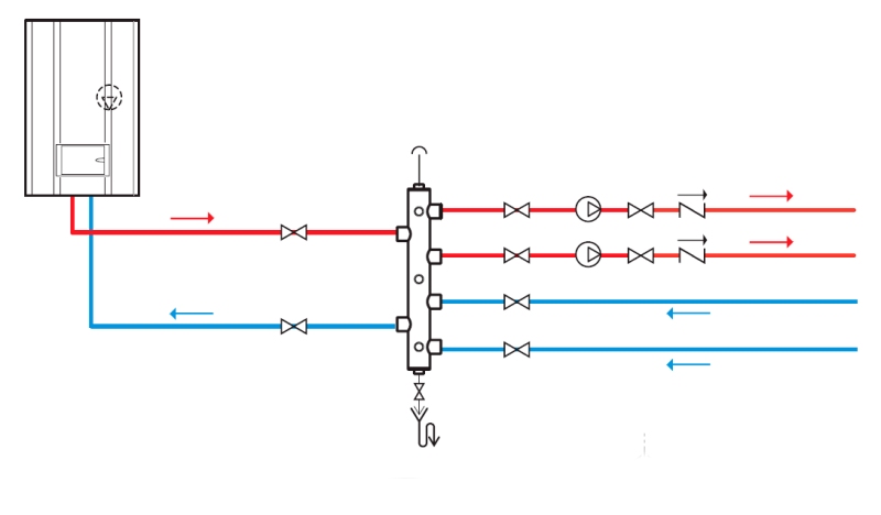 O número de entradas e saídas do coletor é sempre igual ao número de elementos de aquecimento localizados no piso: radiadores ou anéis de aquecimento no piso. Uma ramificação separada é estabelecida para cada sala, que, combinando vários dispositivos de aquecimento, incorporará um esquema de aprovação ou impasse.