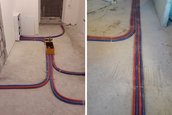 Com a fiação do coletor, o método de colocação de tubos em uma mesa de concreto é usado com mais frequência. Sua espessura varia na faixa de 50 a 80 mm, o que é suficiente para a "monopolização" da fiação da casa do sistema de aquecimento.