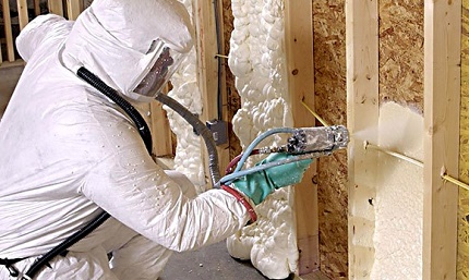Espuma de poliuretano - materialesguichando nas paredes em forma líquida.Possui excelentes propriedades de isolamento à prova d'água e térmico. Após o endurecimento, possui uma estrutura frouxa, sendo quase impossível rebocar a parede.