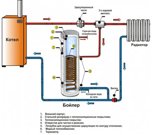 Graças a esse esquema, a eficiência máxima do dispositivo é alcançada, pois o líquido de arrefecimento que circula na bobina aquece a água na parte superior do tanque, transfere o calor restante para as camadas de baixa temperatura e entra na caldeira para novo aquecimento.