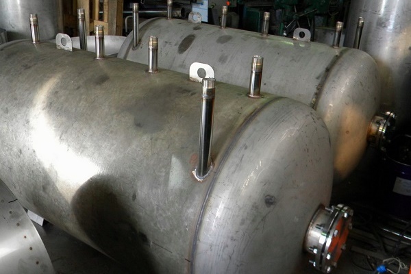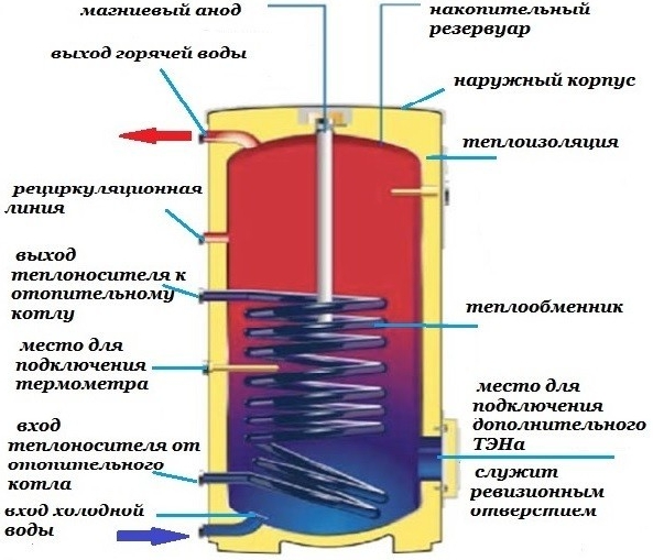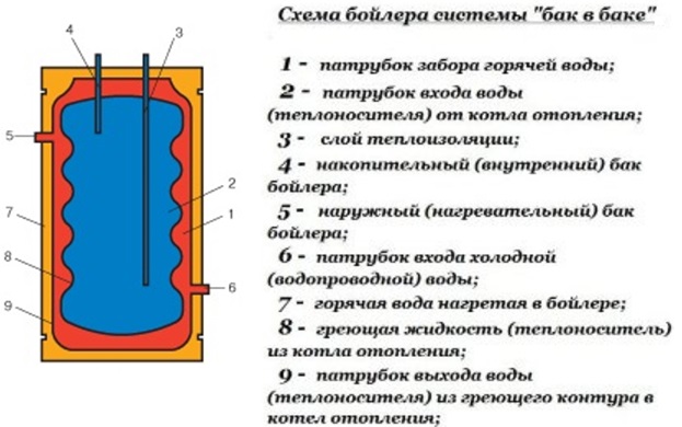 O tanque em si pode ser fabricado na forma de um retângulo ou um cilindro, e são fornecidos bicos nas paredes para a circulação de água quente do sistema de aquecimento e a entrada / saída de tubulações de água.