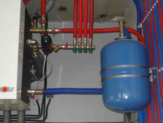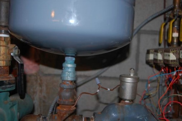 - Tanque de expansão de diafragma, em que o excesso de água fluirá com o aumento da pressão no sistema. Observe que a capacidade da capacidade de reserva deve ser de pelo menos 1/10 do volume do próprio BKN.