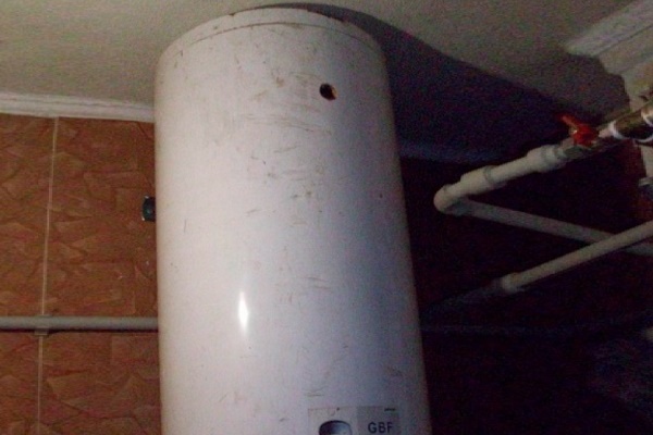 Outra versão de uma caldeira de aquecimento indireto caseira é feita usando uma caixa de um aquecedor de água de armazenamento convencional:
