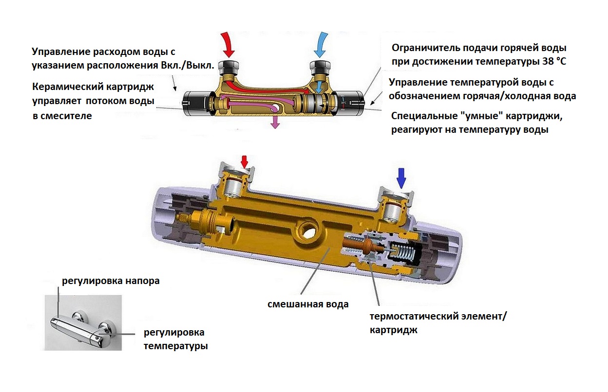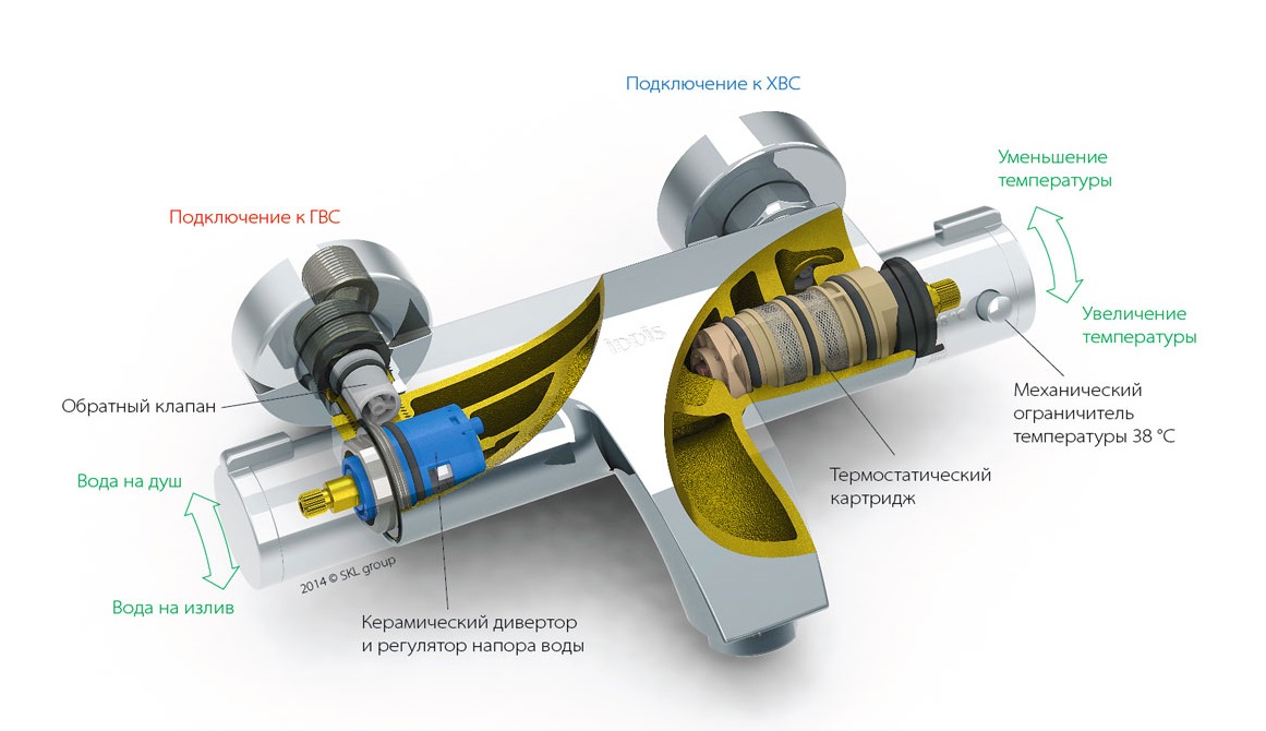 O princípio de operação para todas as torneiras termostáticas é semelhante. Com a ajuda do ajuste, a temperatura necessária é ajustada uma vez e, em seguida, a válvula de abastecimento de água simplesmente se abre.