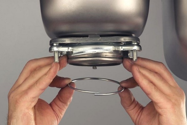 - Para montar a parte superior da instalação, coloque uma junta de borracha e um anel de trava no flange. Depois disso, coloque um anel de fixação com parafusos, bem como um anel de pressão (ele deve travar no lugar).