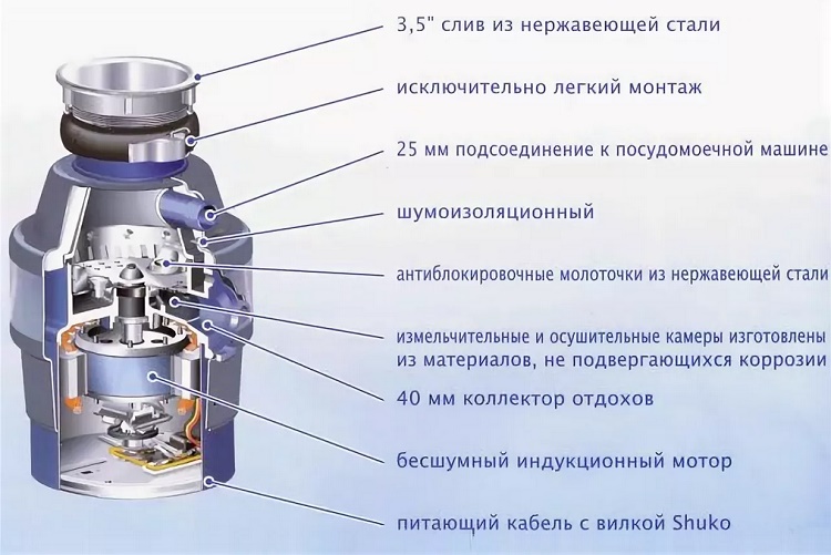 Por fim, o lixo é processado em partículas de tamanho não superior a 3-4 milímetros, que são facilmente lavadas pela água no esgoto. O desperdício de alimentos processado pelo triturador não obstrui os sistemas de esgoto, mas, pelo contrário, limpa os canos.