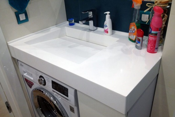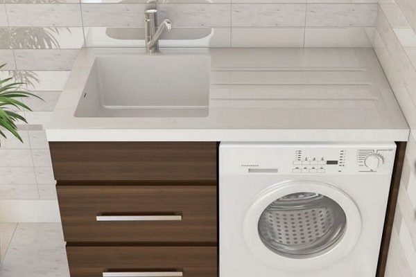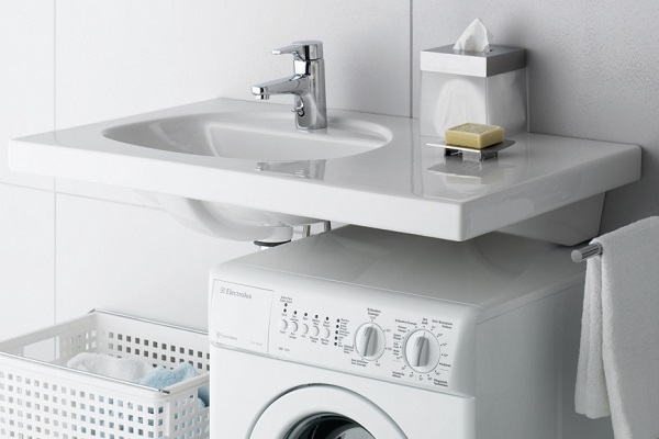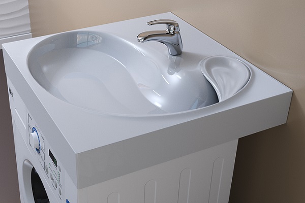 Recomendações do vendedor-consultor da loja de encanamentos sobre a escolha de uma pia para montagem acima de uma máquina de lavar: