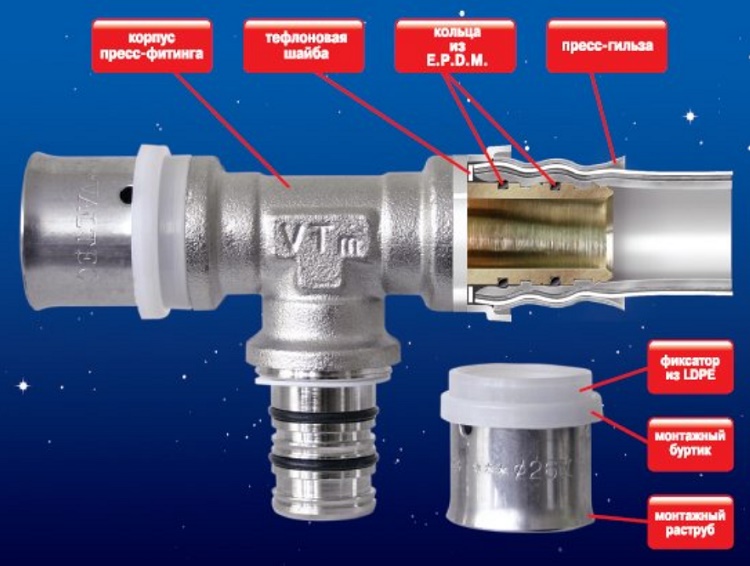 O acessório de prensagem é um elemento moderno para a conexão confiável de tubos de metal-plástico em um único sistema. Consiste em um alojamento no qual a conexão e as vedações estão localizadas, isolando a luva de crimpagem e o anel