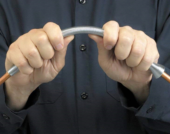 A dobradeira de mola é feita na forma de uma caixa longa, usada em um tubo de cobre. Uma das extremidades desse invólucro é ligeiramente expandida para maior facilidade de uso. Um tubo de cobre colocado em uma bainha elástica é dobrado manualmente, sem o risco de obstrução na dobra.