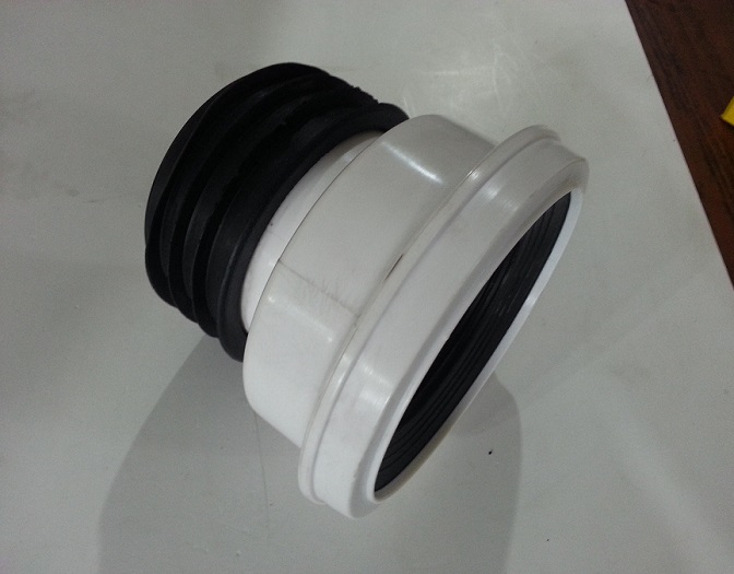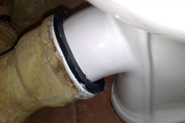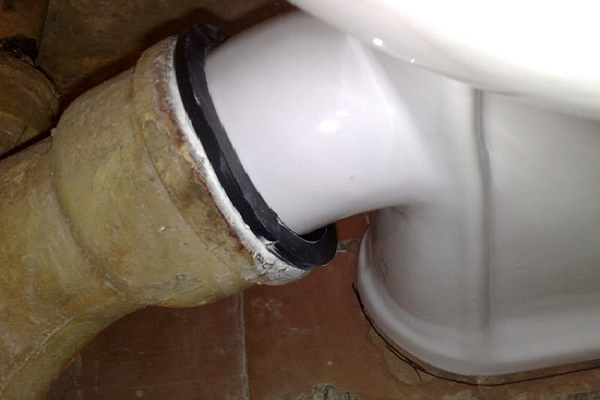 Após a preparação, um selante de silicone à prova d'água é aplicado ao manguito e conectado à tomada do vaso sanitário. Quando o composto de vedação está completamente seco, o sino do tubo de esgoto também é tratado e a outra extremidade do manguito é conectada a ele.