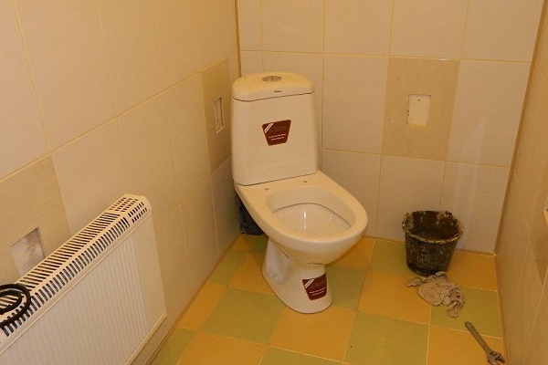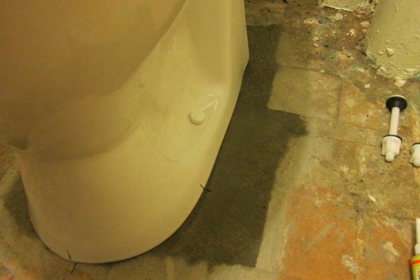 Para tornar o banheiro mais atraente no futuro, faça um pequeno recesso no local determinado para a instalação, limpe-o cuidadosamente de detritos e poeira, encha-o com a solução preparada para as bordas e coloque o vaso sanitário em cima, encharcando as bordas da sola com água.