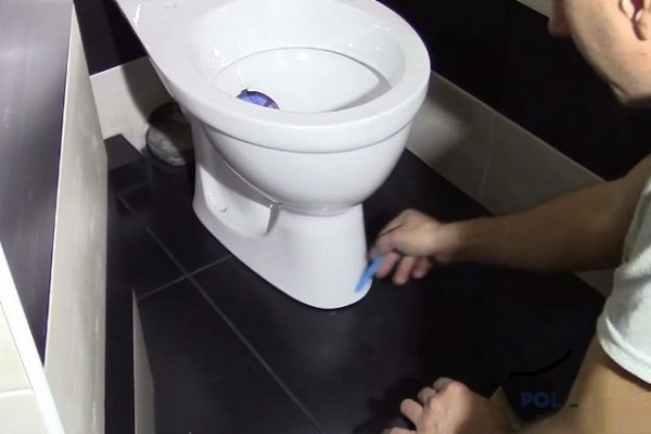 Antes de fixar o vaso sanitário no chão com uma mistura adesiva, as duas superfícies a serem unidas são bem limpas, enquanto limpam simultaneamente os possíveis detritos e poeira.