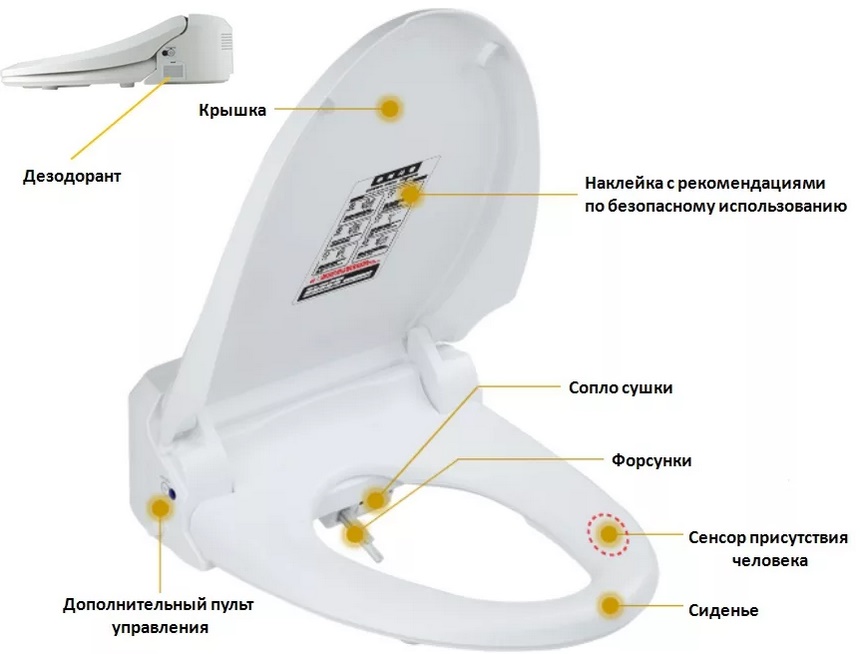Os assentos multifuncionais para bidê, na forma de tampas removíveis, podem ser equipados com vários bicos e um console de controle. Quando fechados, eles não diferem externamente dos análogos comuns; apenas o controle remoto do lado pode causar constrangimento pela ignorância.