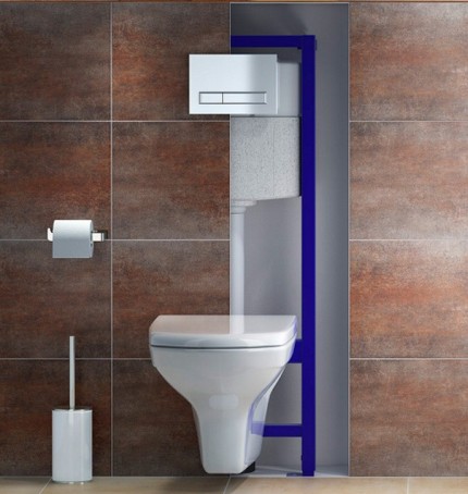 Em seguida, você pode mascarar novamente o quadro de suporte e instalar um vaso sanitário nos pinos de montagem fixados nele. Nos banheiros montados na parede, o tanque de drenagem é apenas um componente do bloco, cuja substituição dura vários minutos. Mas o desmantelamento e a instalação da caixa decorativa podem se arrastar por semanas.