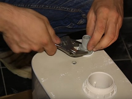 Segundo passo. Instalando uma válvula de preenchimento. Seu tubo de derivação pode sair de ambos os lados do tanque, dependendo do modelo.