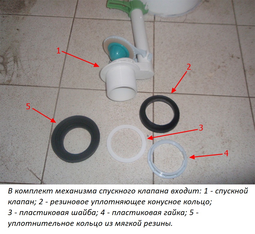 Sexto passo. Aparafusar a tampa e o botão de drenagem. O mecanismo da válvula de drenagem é acionado por um botão, que geralmente é parafusado em sua parte superior. Como resultado, o corpo da válvula é esticado entre o orifício de drenagem na parte inferior e o botão na parte superior.