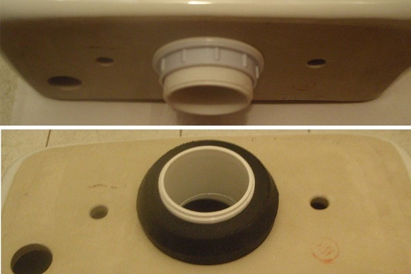 Passo três. Instalação de um selante. Uma luva de borracha é colocada no tubo de saída da válvula de drenagem. Em alguns modelos, é mais conveniente colocá-lo em uma ranhura na prateleira do vaso sanitário. Embora esse selante grande não seja pressurizado, é recomendável lubrificá-lo nos dois lados com uma fina camada de selante.