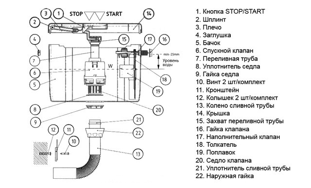Ao substituir o tanque de drenagem, o esquema de sua operação não é tão importante, porque os mecanismos internos de um novo produto geralmente são instalados no interior ou uma instrução de instalação individual é anexada a eles.