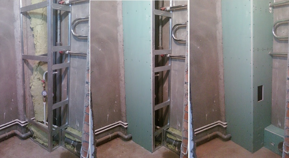Se houver uma possibilidade tecnológica, você pode ocultar os pontos de conexão instalando uma parede de estrutura com drywall. Naturalmente, as duas opções descritas requerem acabamento.
