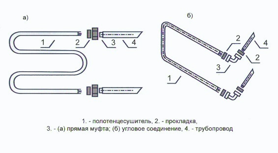 Para criá-lo, as camisetas são instaladas nas extremidades dos tubos de metal. Duas saídas direcionadas uma à outra são conectadas por um tubo reto. As saídas laterais são usadas para instalar elementos de travamento nos quais os tubos que levam ao toalheiro aquecido.