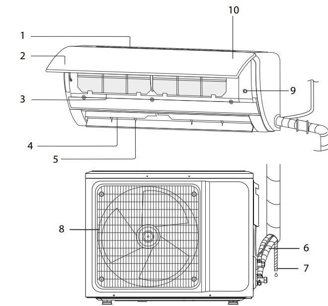 O design do sistema dividido é padrão: duas unidades conectadas por tubulações. Um deles está localizado do lado de fora da casa, o segundo - em uma das salas internas.