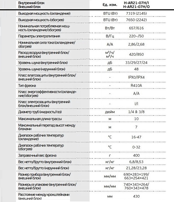 Externamente, os dispositivos da série Allegro são semelhantes, a diferença são apenas as características técnicas - potência, fluxo de ar, ruído, faixa de temperatura etc. O modelo AR21 07H é o menos potente. Por exemplo, se compararmos a potência de saída no modo de aquecimento, às 07H é 2242 W e às 24H é 7706 W.