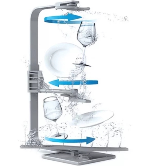 Os engenheiros da Hans desenvolveram uma pia 3D, que pressupõe a presença de três níveis independentes de água de pulverização. Isso melhora muito a eficiência da lavagem da louça.