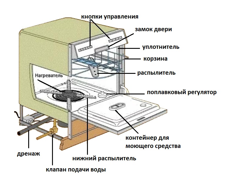 Cada um dos principais nós de trabalho que examinamos em mais detalhes em nosso artigo: O dispositivo é uma máquina de lavar louça típica: design, finalidade e manutenção de várias peças.