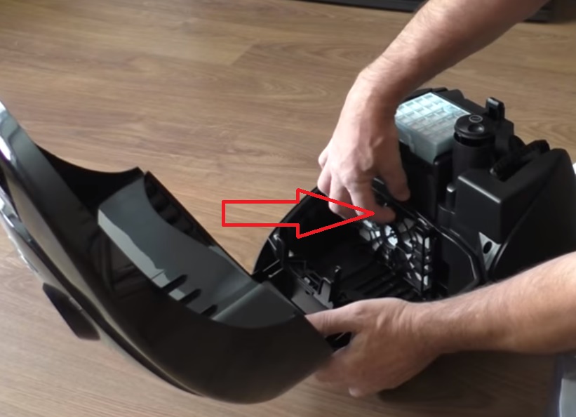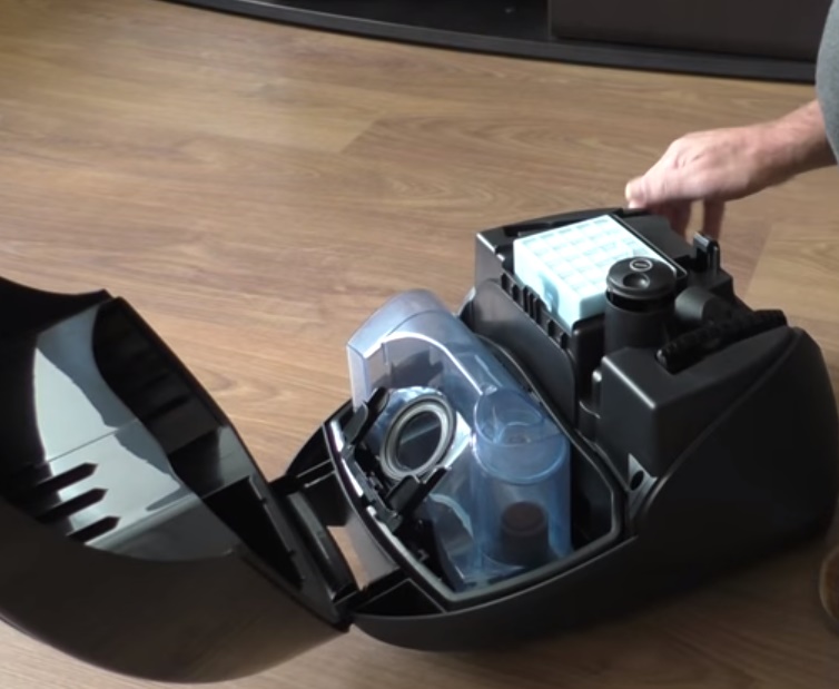 A fixação desta parte plana é semelhante à localização na maioria dos outros tipos de aspiradores de pó do tipo recipiente projetados para lavagem a seco. Basta puxá-lo para cima e ele sairá das ranhuras. Pode ser lavado em água, purgado com um compressor ou sujeito a uma simples limpeza a seco.