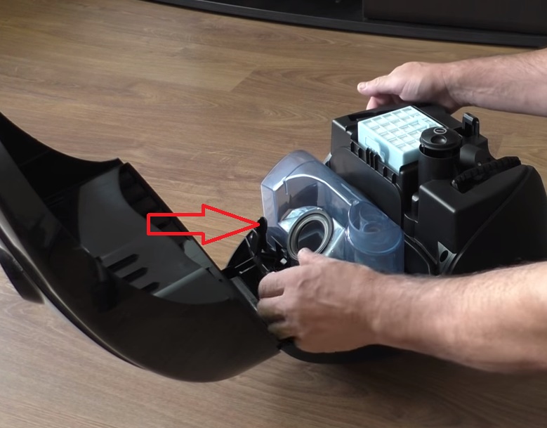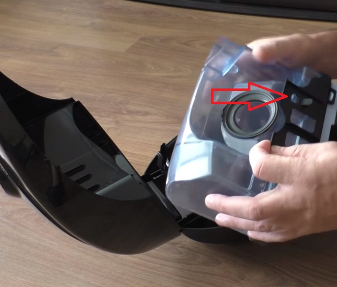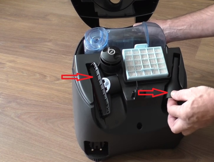 Para limpar e enxaguar os filtros, será necessário desmontar a seção inferior do recipiente. Para fazer isso, pressionando a tecla lateral, desaperte o filtro secundário sintético do departamento de limpeza principal com um filtro de espuma.
