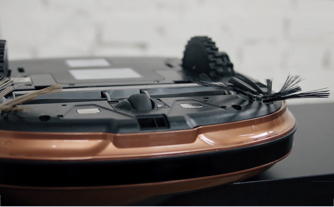 Na parte inferior existem duas rodas laterais e uma auxiliar. O curso da suspensão permite que o dispositivo supere obstáculos com menos de um centímetro e meio de altura. Normalmente, isso é suficiente para passar de uma sala para outra sem assistência. Todas as rodas podem ser removidas para limpar detritos: cabelos, fios, lã, etc.