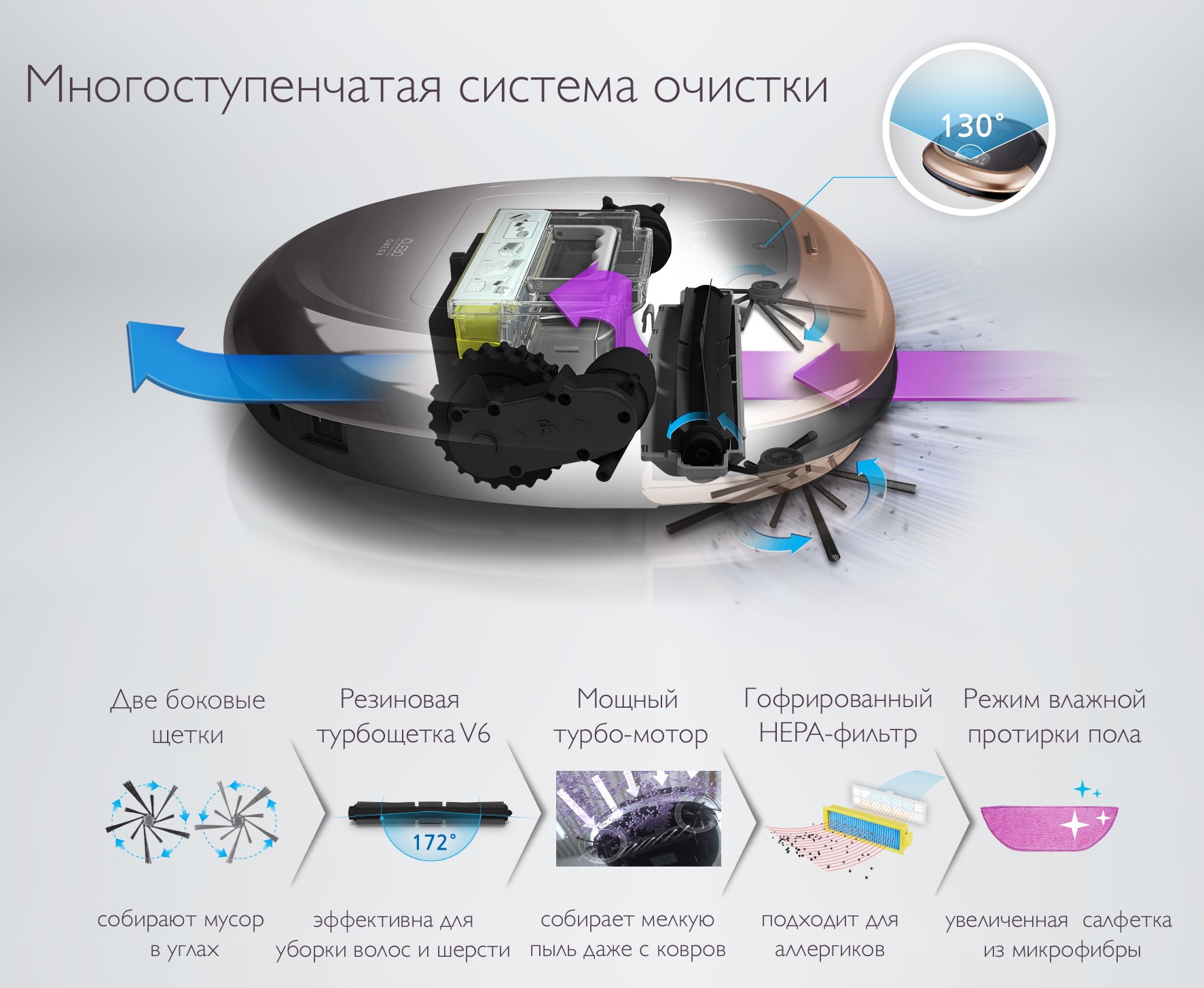 O aspirador de pó robótico realiza a limpeza dos cantos e rodapés, bem como o processamento da superfície principal. Aproximando-se de lugares inacessíveis, o aspirador de pó sobe um pouco. O design das escovas laterais permite que você varra cuidadosamente os detritos dos cantos.