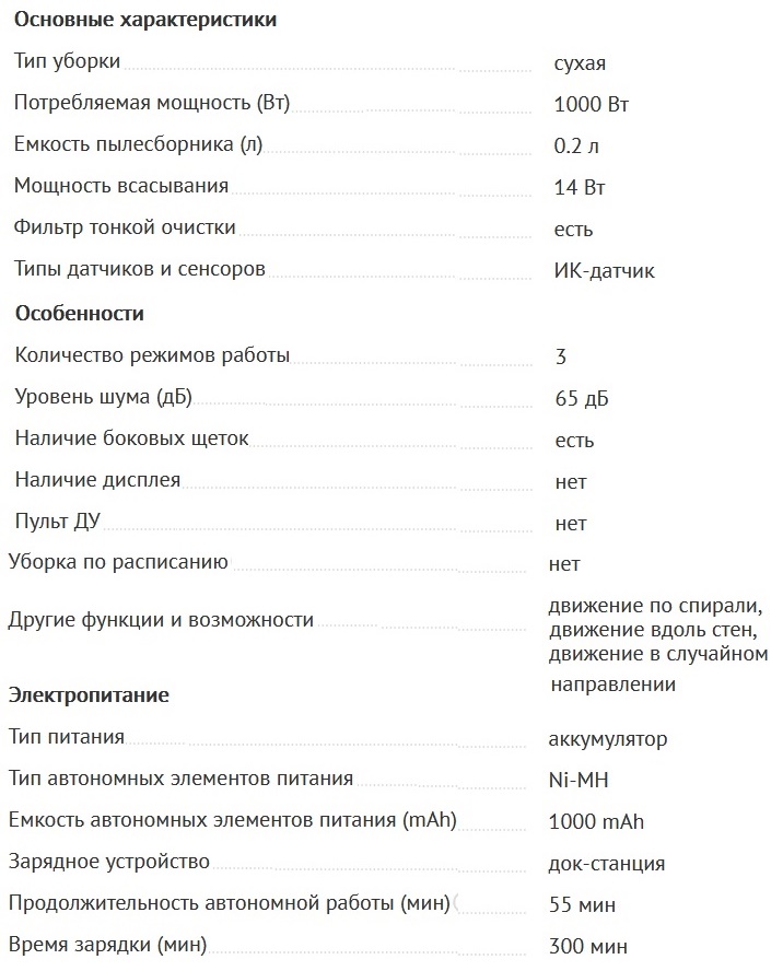 Para se familiarizar com os parâmetros técnicos do aspirador, não é necessário estudar as instruções - a lista de características é impressa diretamente na caixa. A partir dos números, é fácil determinar se o carro pode lidar com a limpeza do apartamento. Para alguns indicadores, fica imediatamente claro por que o robô não custa 11-14 mil rublos, como outros aspiradores de pó da mesma categoria, mas apenas 5 mil rublos.