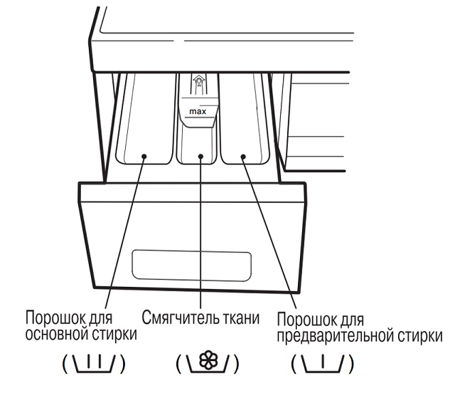 - Compartimento Médio, números são aplicados nele Eu 1 qualquer letra Um, Ele foi projetado para encher o sabão em pó, usado para pré-lavar a roupa. Aqui você pode adicionar alvejante ou removedor de manchas.