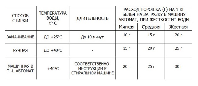 A prática mostra que bons resultados de lavagem podem ser obtidos com muito menos detergente. Para produtos levemente sujos, basta adicionar 1 colher de sopa de pó com uma colina (25 g) por 1 kg de roupa.
