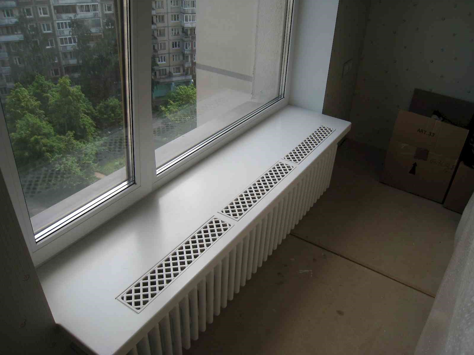 Até o mestre inexperiente pode fazer os furos necessários e consertar a grade de ventilação. O método é adequado para peitoris de janelas de profundidade média e grande, cuja parte saliente se sobrepõe significativamente à bateria de aquecimento. As grelhas de ventilação permitem que o ar passe livremente pelo parapeito da janela e em quantidades suficientes para entrar na janela com vidros duplos.