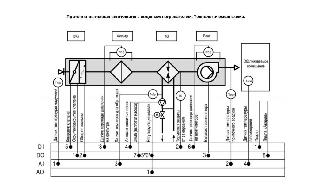 Os painéis de controle da ventilação diferem funcionalmente dos quadros elétricos. O objetivo deste último é a distribuição de eletricidade entre grupos, o que se presta a uma descrição gráfica. O objetivo do SCHUV é controlar muitos elementos interdependentes do sistema de ventilação. Para explicar claramente a complexidade da operação do painel de controle, apliquei seu diagrama funcional.