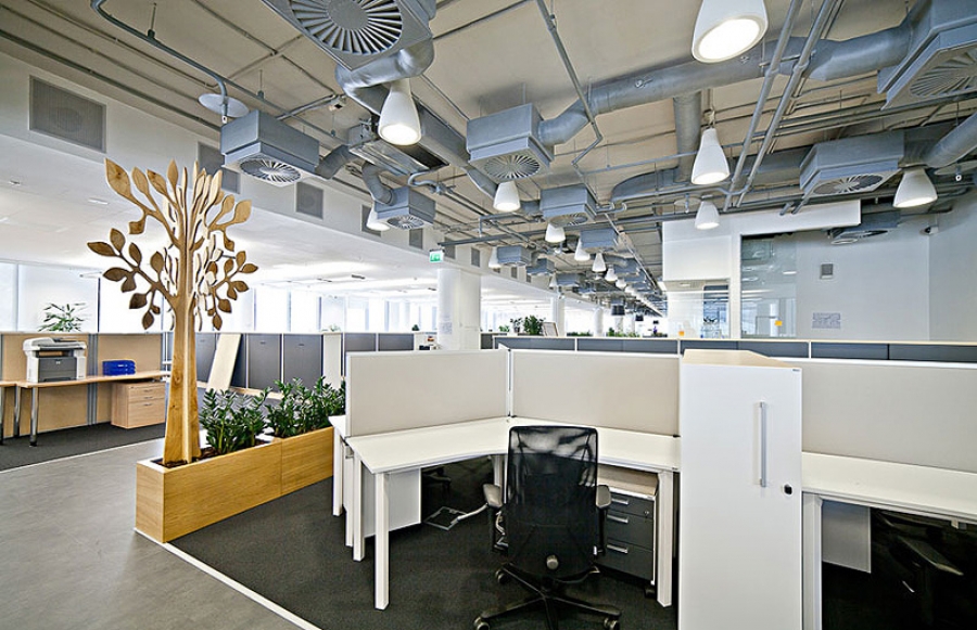 Em grandes salas de escritórios, eles desenvolvem um sistema desenvolvido de troca geral e ventilação local com válvulas, distribuidores de ar, aquecedores de ar, isolamento térmico e controle automático