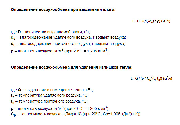 Além do cálculo de substâncias nocivas, a taxa de troca de ar é importante ao controlar a quantidade de umidade e calor na sala: as fórmulas correspondentes são mostradas nesta imagem