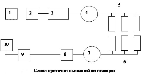 Dispositivo de ventilação de suprimento e exaustão (de 1 a 10): entrada de ar, limpeza, dutos de ar, ventilador de suprimento, dispositivo de suprimento de ar, dispositivo de remoção de ar, ventilador de exaustão, coletores de poeira e gás, filtros, dispositivo de exaustão de ar
