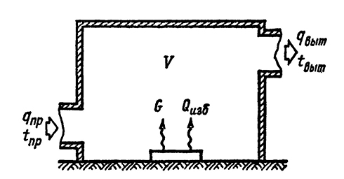 Troca de ar no interior: Q cabanas - calor excessivo, G - gases ou vapores nocivos, V - volume da sala, q pr - concentração de gases ou vapores nocivos no ar que entra, q sai - o mesmo, mas no ar que sai, t pr - temperatura da entrada ar, tout - saída
