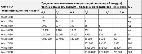 Existem 9 classes de salas nas quais é permitida uma certa concentração de poeira e microorganismos no ar, de acordo com GOST ISO 14644-1-2000.